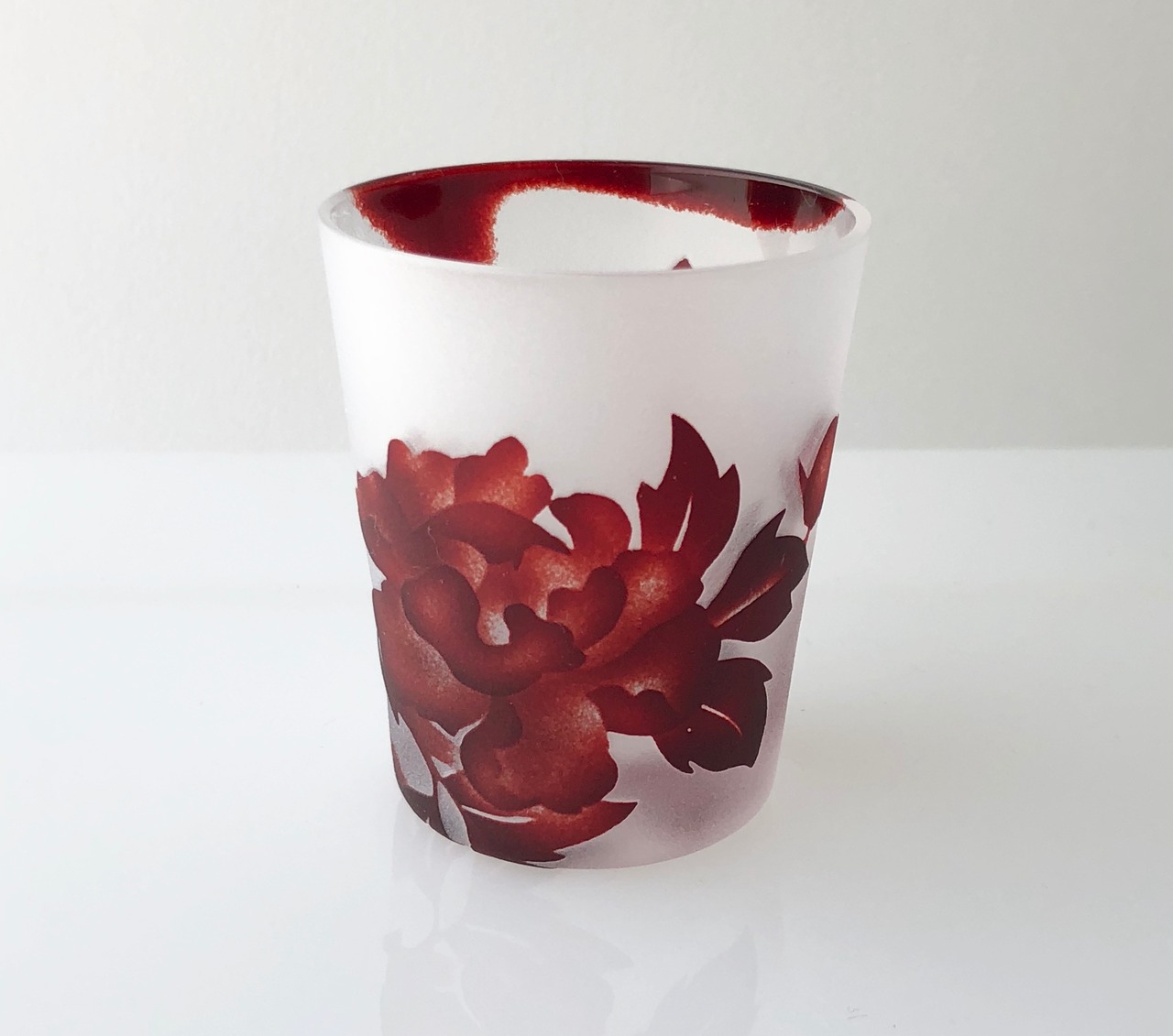 「蝶に牡丹」(花札で人気の絵柄)を赤いグラスに全面に彫り入れてみました。