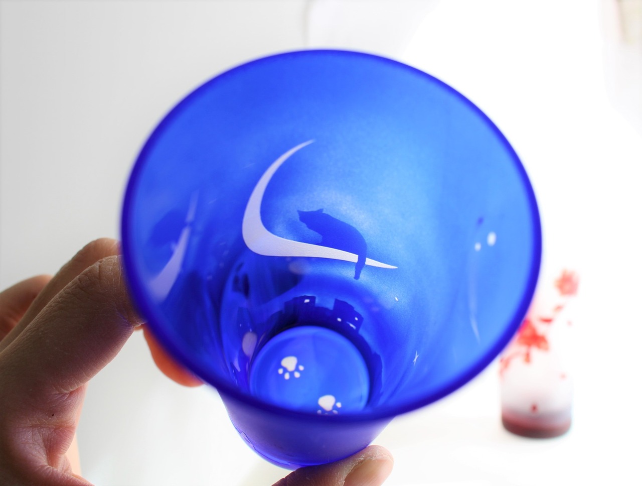 青:三日月にで寝そべる猫が幻想的なグラス。
