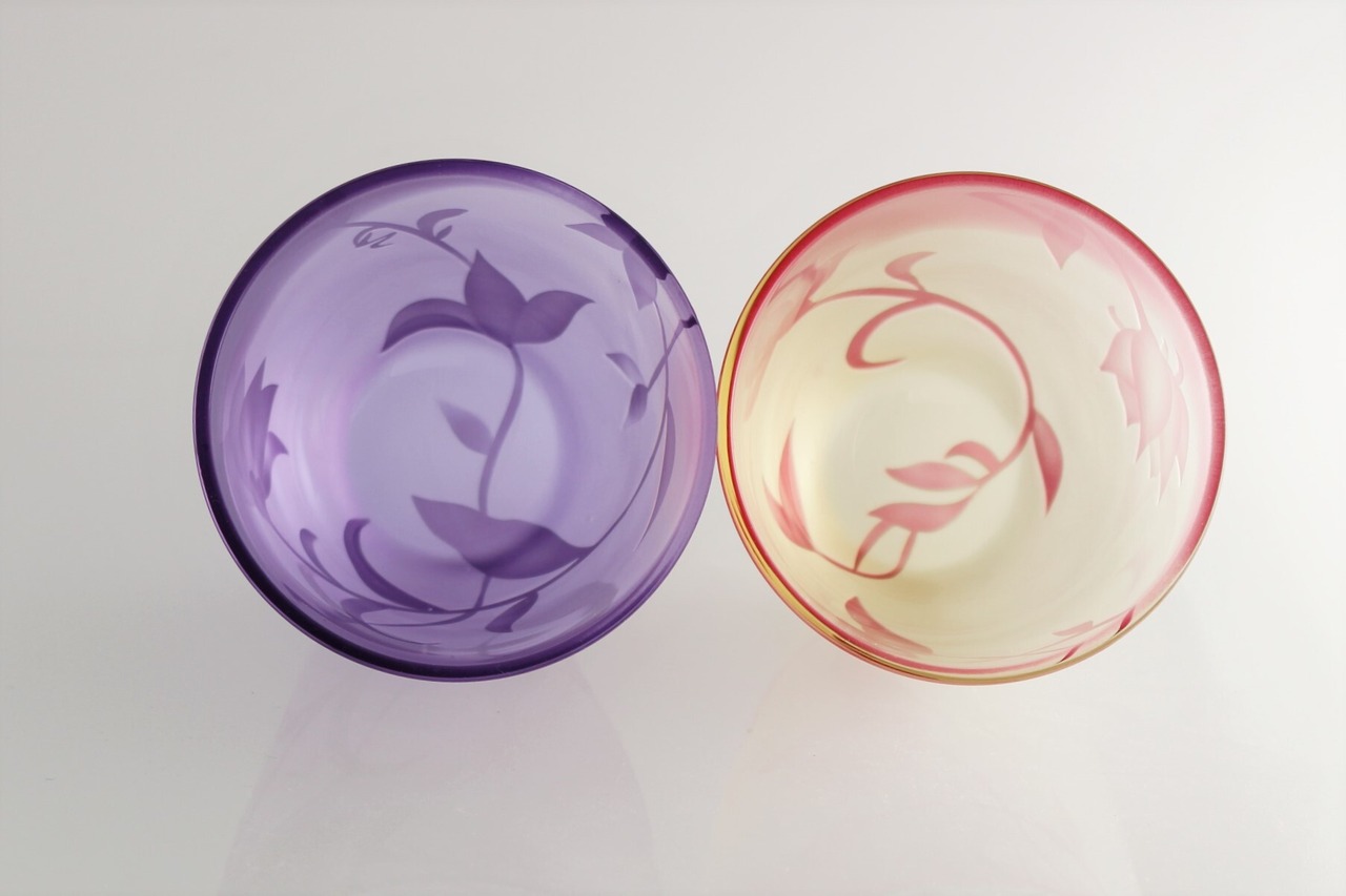 HANA ~花からくさ模様~ペアぐい吞み ガラスのおちょこ ペアグラス 紫 ピンク