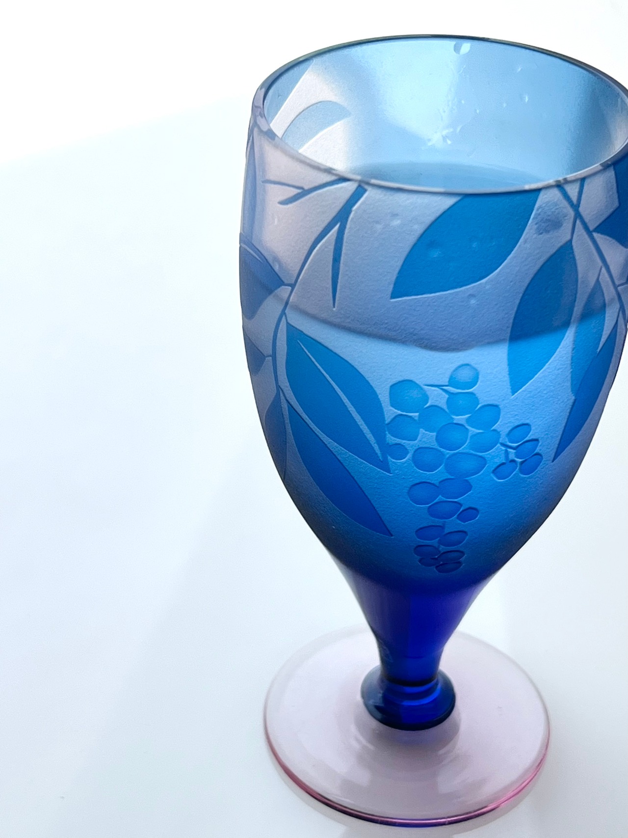【江戸硝子】足付きグラス 水色ピンク 切り絵風 小庭の南天 小ワイングラス