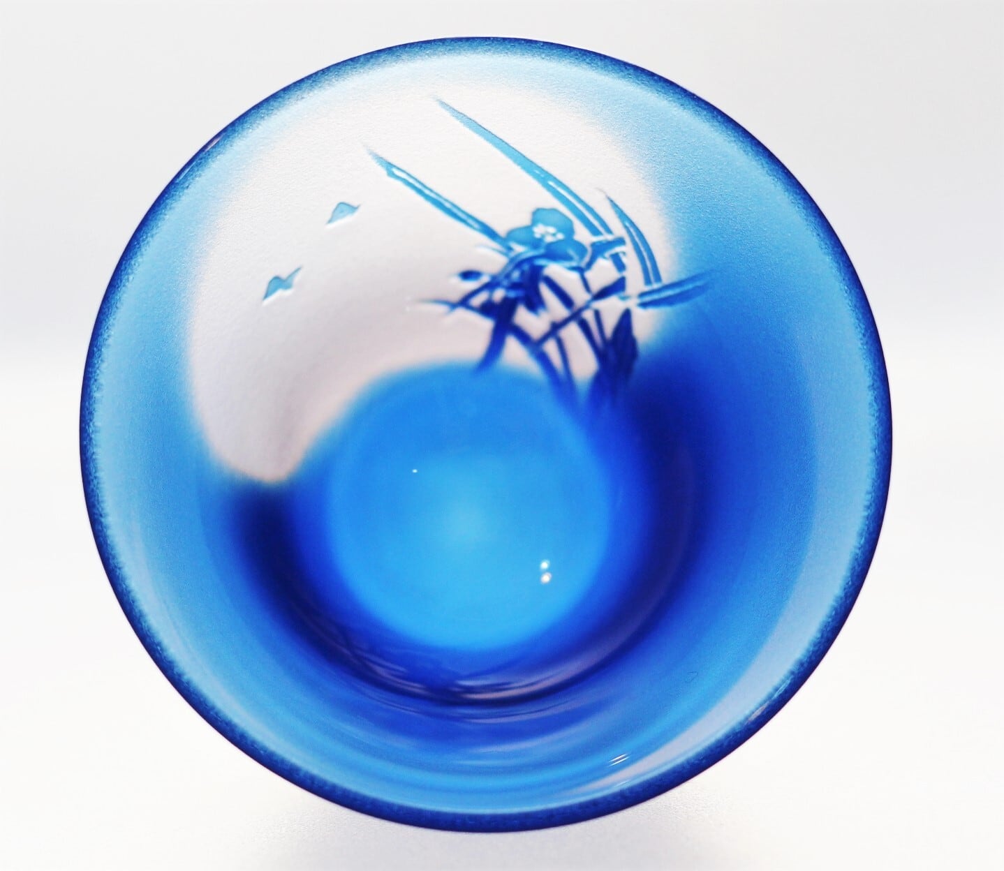 手づくりされた被せガラスのおちょこに、丁寧に花びらをかさね、ぼかし彫りをしたカタクリの花。